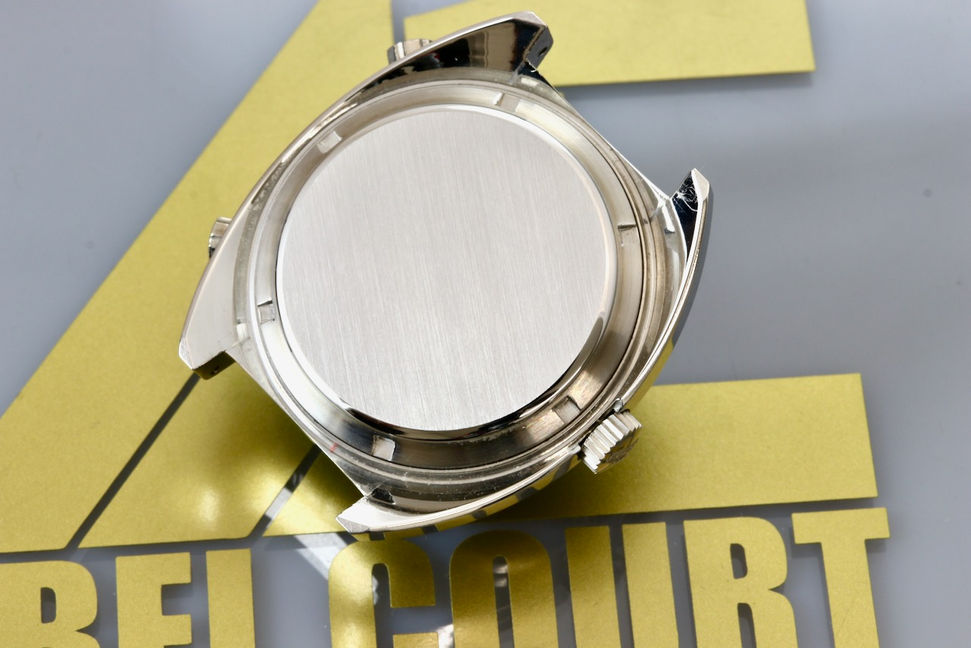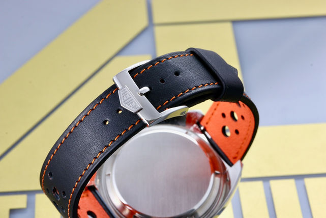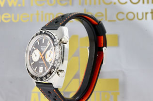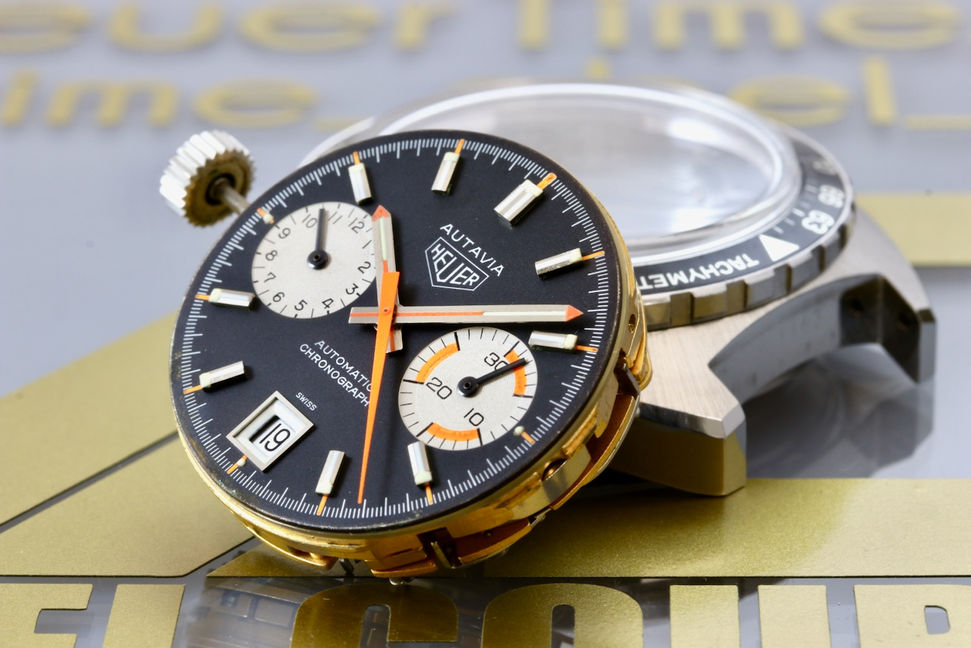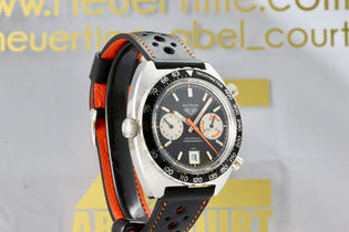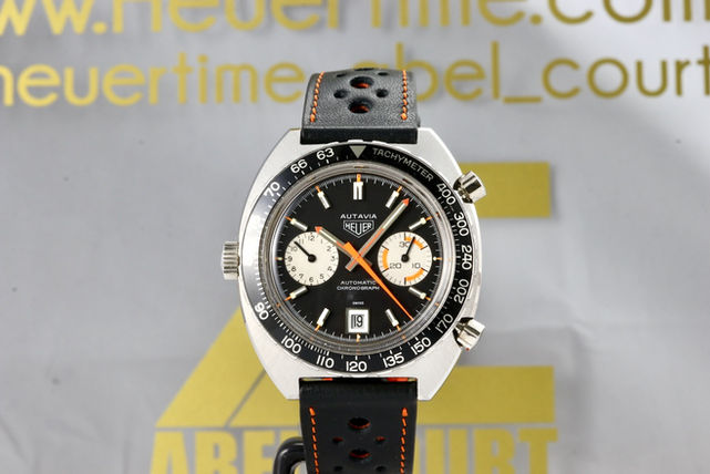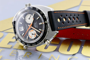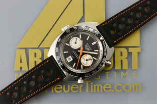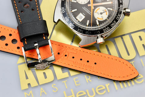 Heuer Autavia reference 1163 "Orange Boy". This is the true "Orange Boy" as this nickname is very often wrongly used. Orange Boy Autavia uses a ref.1163 (non V stamped) case, dial is black with white subregisters and orange accents. Quite a rare and very desirable Autavia in stunning conditions. Fat case. Fully serviced caliber 12 movement, working flawlessly, comes with 2 year warranty. Original dial and hands in mint condition without noticeably marks or scratches. Case has been detailed superficially with respect to originality, super sharp and still fat, gorgeous. Pushers/crown in perfect condition. The original tachymeter bezel still in very good condition. Both reference and serial numbers remain perfectly visible and are correct for this model/reference. Comes on a matching "AC Signature" racing strap with re-issue Heuer buckle. If you would have any further interest or want to buy this watch, please let me know by email.