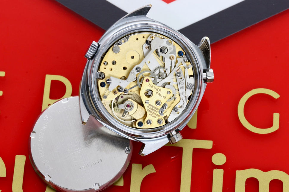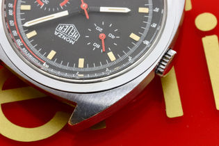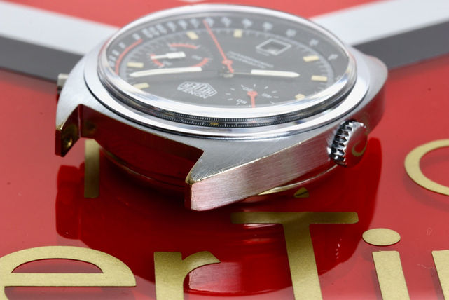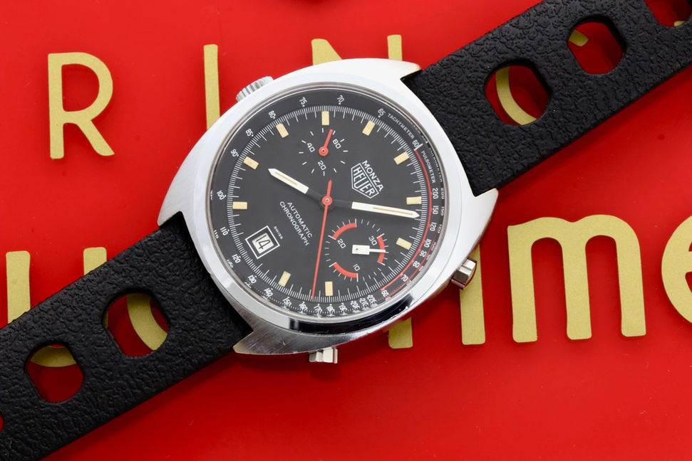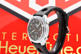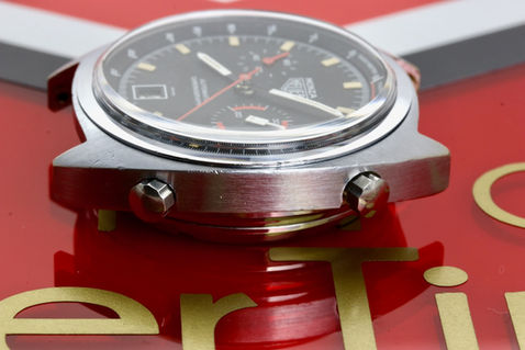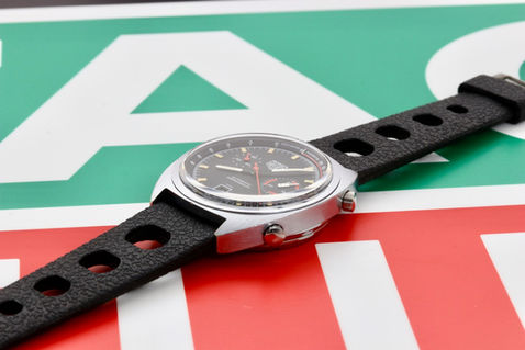 Heuer Monza reference 150.511, equipped with a fully serviced and strong running Heuer Caliber 15. Dial and hands are in original untouched condition with original lume plots still present on the dial and original tritium still present on the hands. Case is a chrome plated case and bezel with a stainless steel cseback. Reference and serial number still perfectly visible. Also the original inner tachymeter bezel is in perfect condition. Case is showing minor wear and still has the original finish, original pusher and crown have been serviced and all contain fresh seals. Perfect plexi. Comes on a tropic strap. If you would have any further interest or want to buy this watch, please let me know by email.
