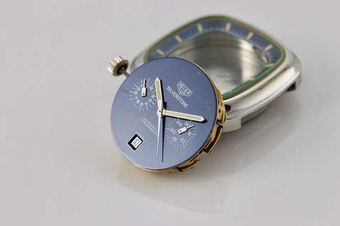 Heuer Silverstone, blue version wich seems to be te rarest. In remarkable collectors condition all around. Fully serviced caliber 12 movement, working flawlessly, comes with 2 year warranty. Dial and hands with original tritium. Inner bezel in perfect condition, with perfect lume strips still in place. Case remains in supervise condition super sharp and with both serial and reference numbers perfectly intact. Pushers/crown in perfect condition, all seals have been replaced. Mineral crystal in perfect shape. Watch comes on a nice blue complementing abcoro racing strap with re-issue Heuer buckle. If you would have any further interest or want to buy this watch, please let me know by email.