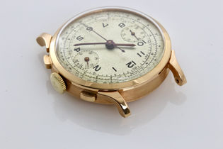 Mesmerising and curious. "No Name" 18 karat rose gold chronograph. Equipped with a fully serviced and perfectly running Valjoux 71 movement, comes with 2 year warranty. Possibly this watch was made in a Swiss watchmaking school during the late 40-ties/early 50-ties, as both the movement and the dial remain unsigned, was quite a common practise back in those days. Case shows serialnumber 251216 on the outside and reference number 1169 on the inside of the solid/massive caseback. Very elegant case with super nice lugs, which are solid gold and not hollow, very well constructed which you can feel by the actual weight of the watch itself. Original dial and hands showing great patina, hands are executed in beautifully blued steel, typical for that period as well. Comes on a nice and matching tan brown calfskin strap with goldplated buckle. If you would have any further interest or want to buy this watch, please let me know by email.
